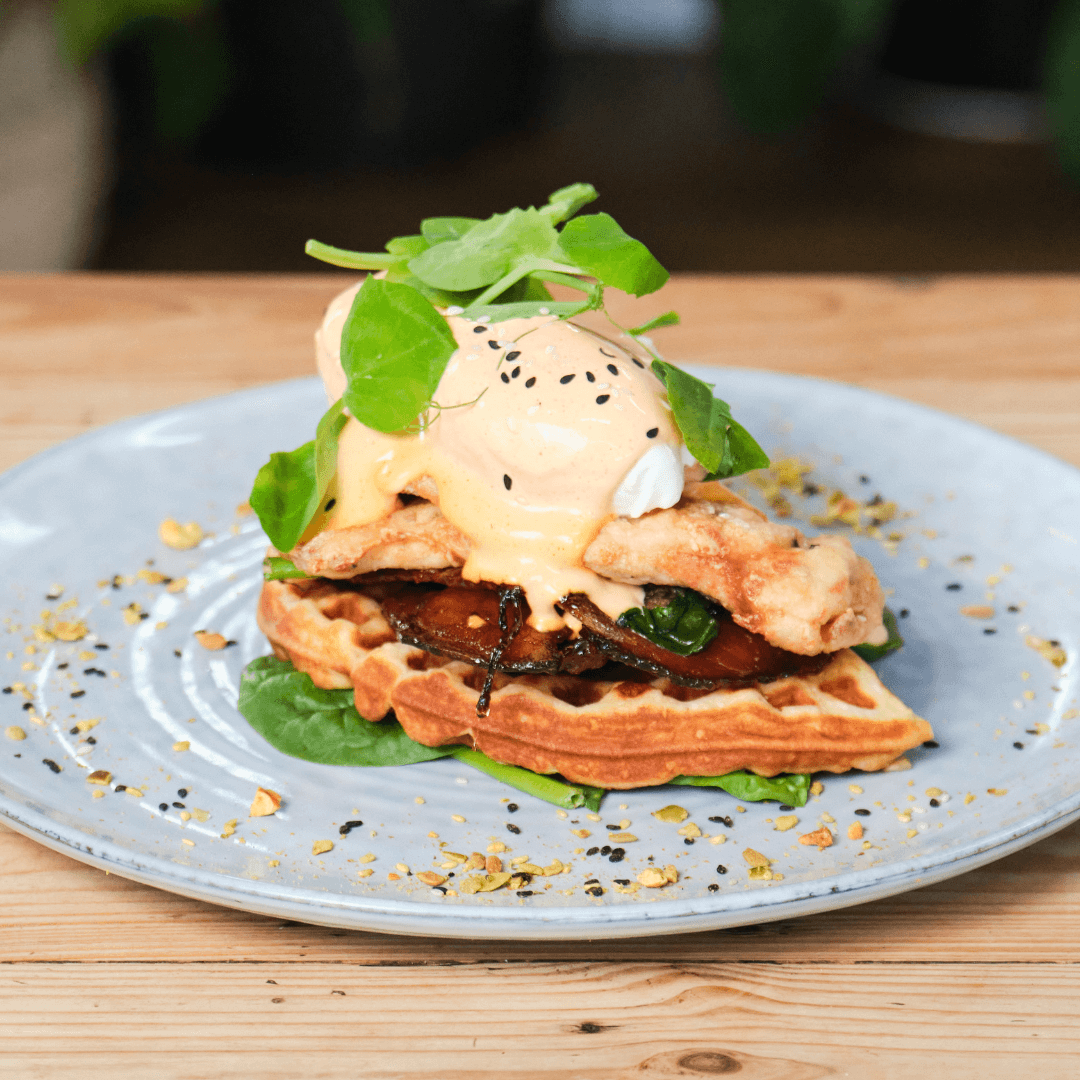Cajun fried chicken tenders, maple-glazed bacon, poached eggs & gochujang hollandaise on a house-made waffle. |