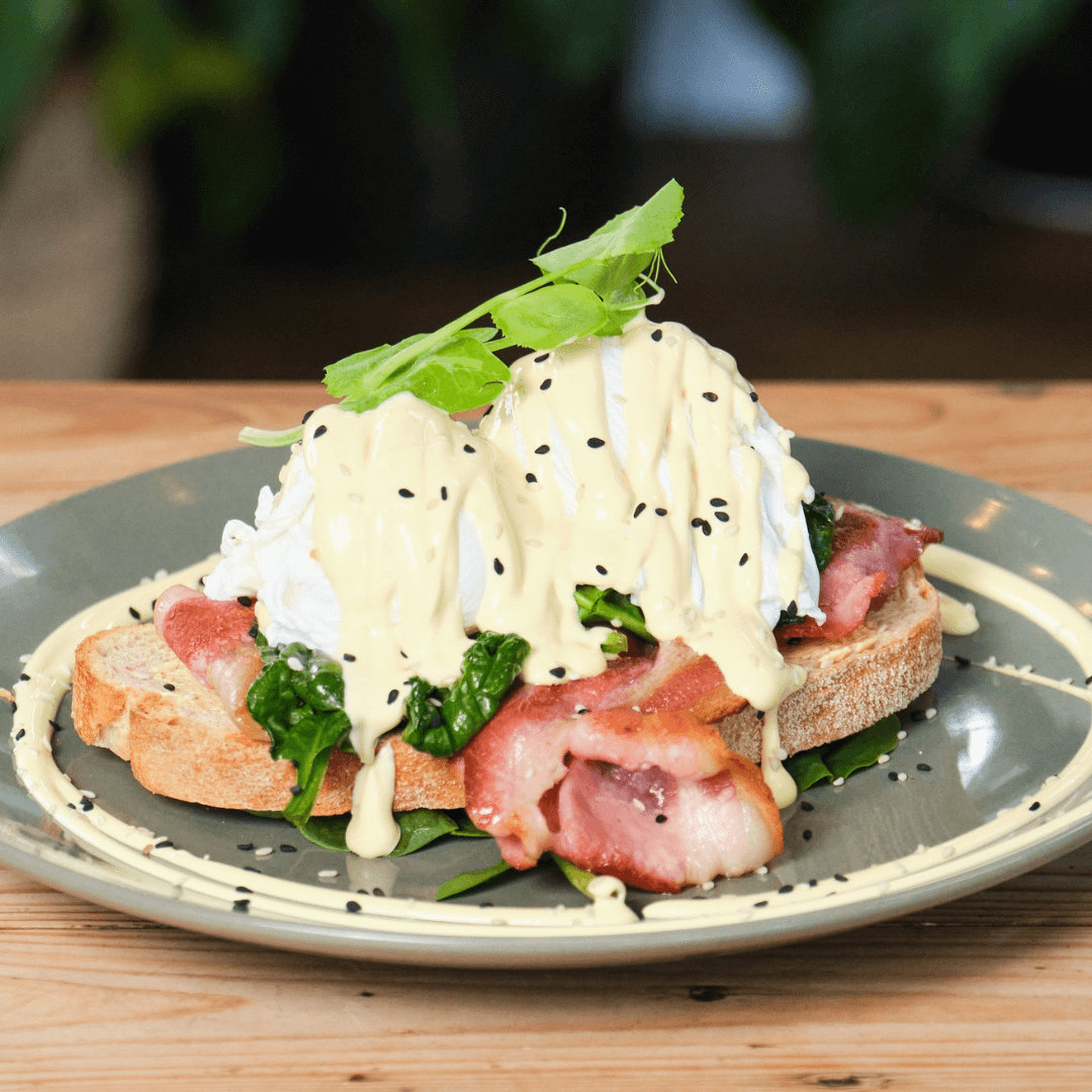 Choice of bacon or halloumi topped with two poached eggs, wilted spinach & hollandaise. – Upgrade to smoked salmon +$6 |