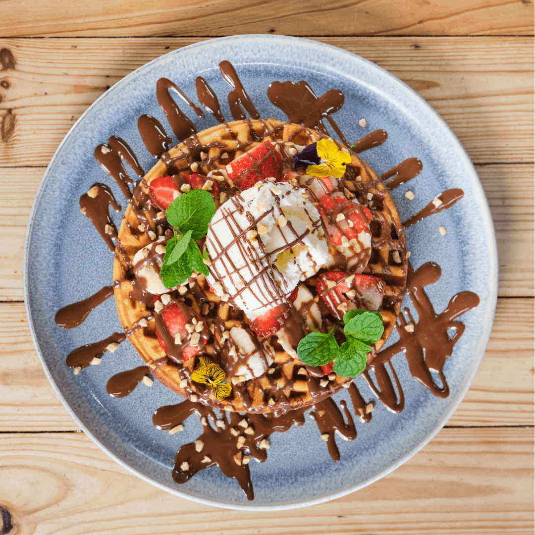 House-made Belgian waffle loaded with strawberries, banana, vanilla ice cream, toasted peanuts & Nutella drizzle. |