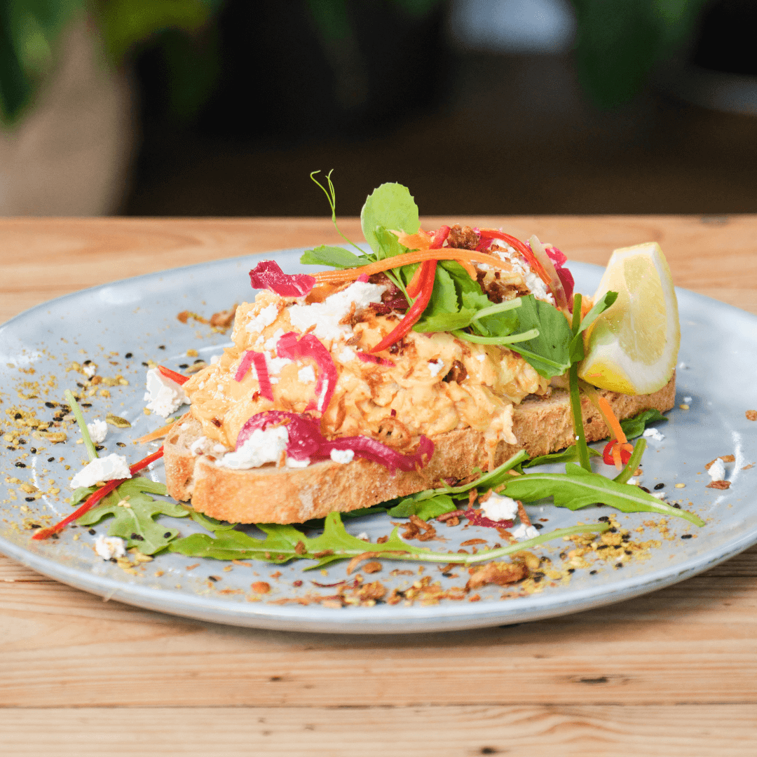 Fluffy chilli scrambled eggs with feta, pickled red onion & fried shallots on toasted sourdough. Add bacon +$6 | VO: scrambled chilli tofu |