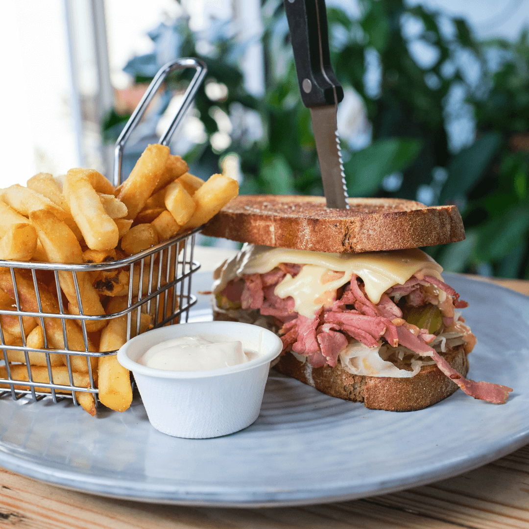 Pulled corned beef, sauerkraut, pickles, Swiss cheese & Russian dressing on toasted rye sourdough. |