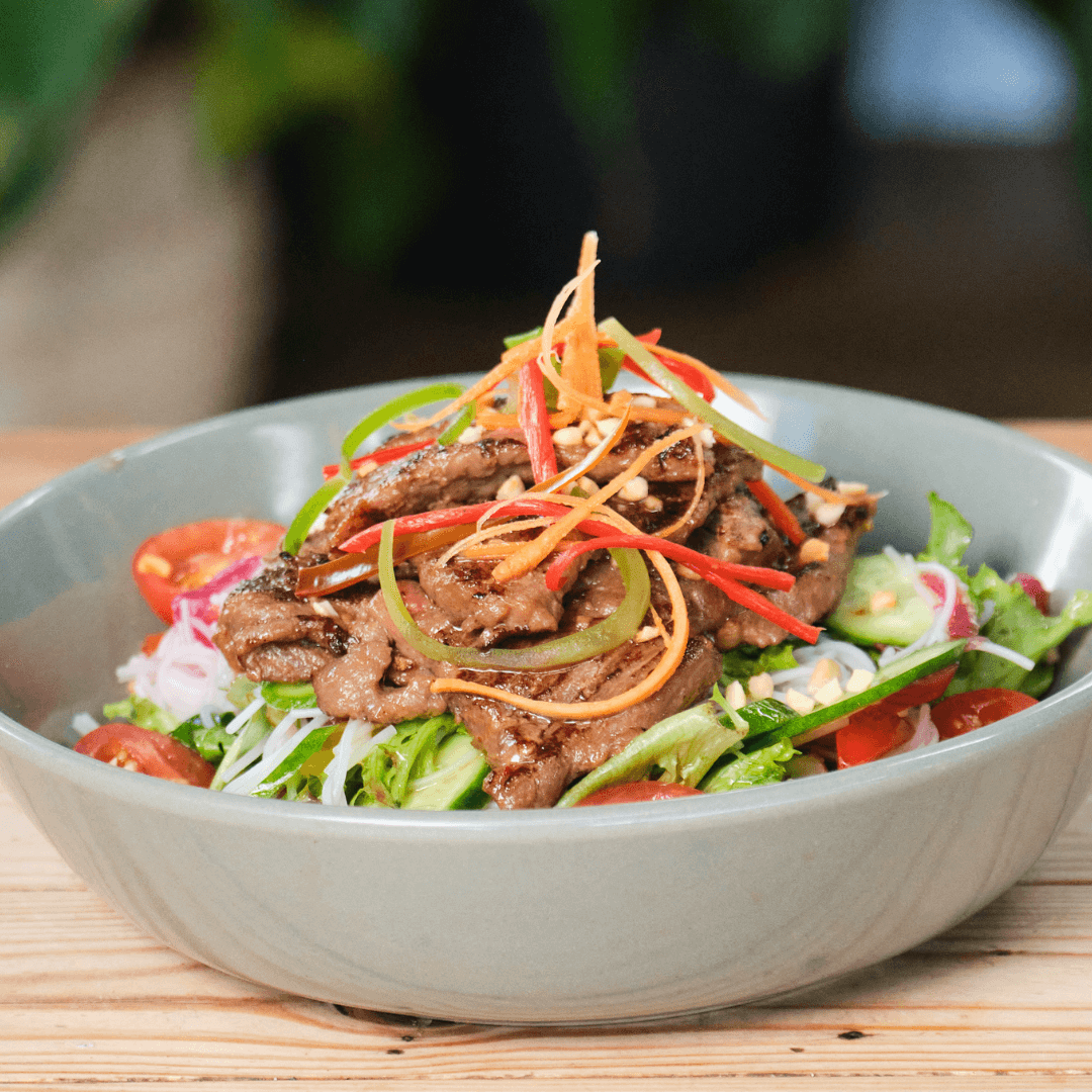Mix mesclun, cucumber, sliced capsicum, pickled onion, toasted peanuts, coriander & Thai basil with vermicelli noodles and Thai beef. VO → tofu |