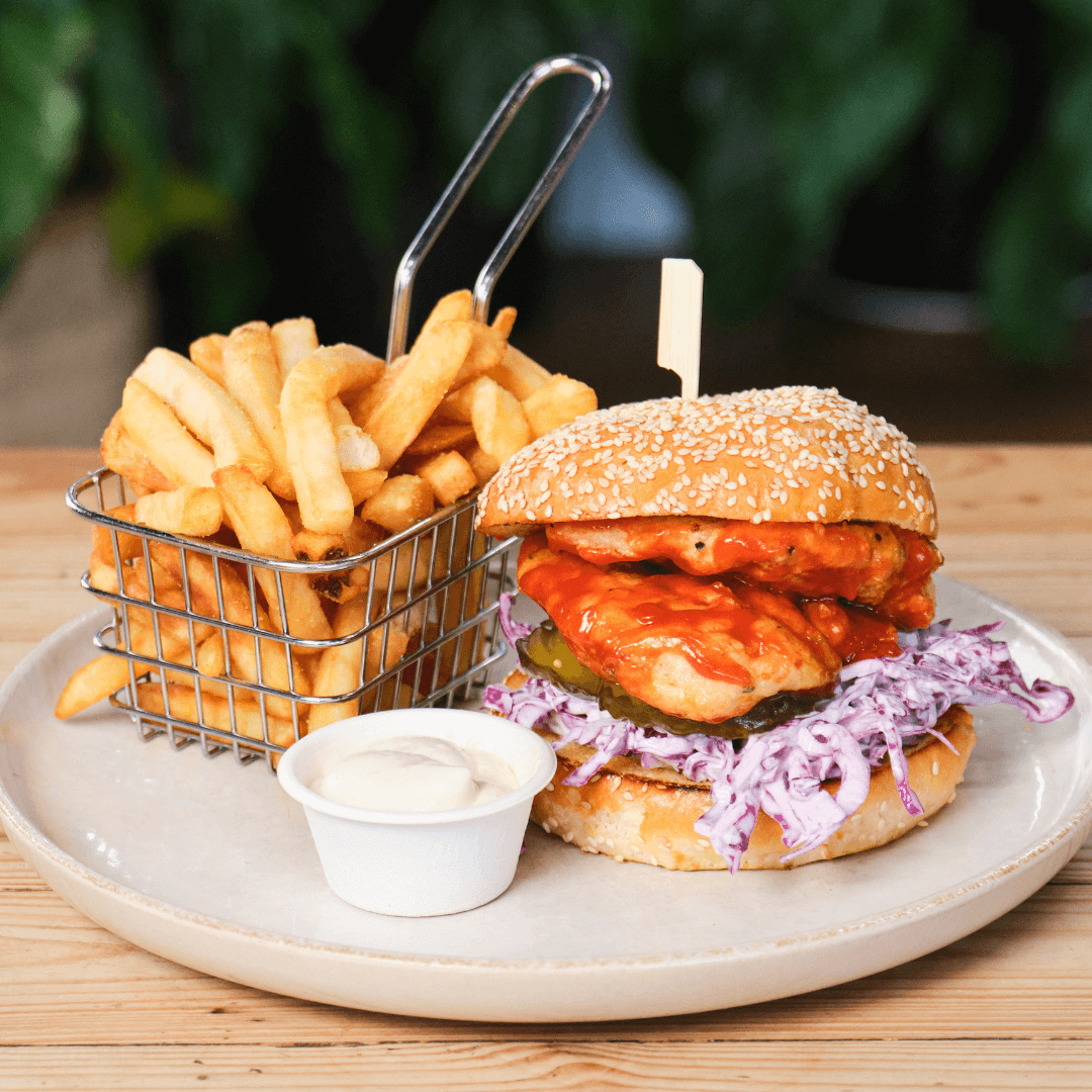 Crispy chicken tenders tossed in gochujang ketchup with red-cabbage slaw & pickles on a toasted milk bun. |
