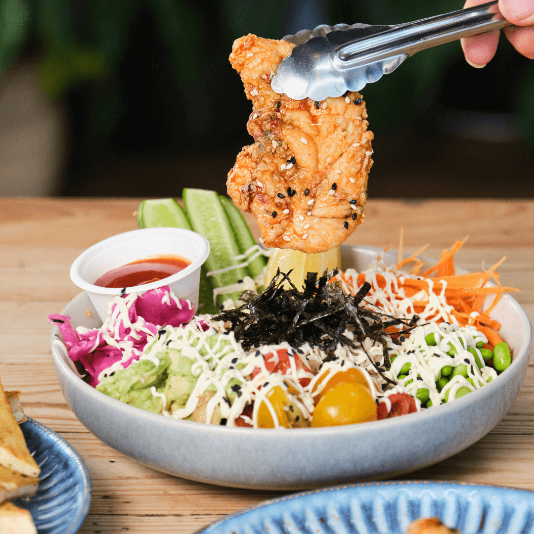 All served with brown rice, edamame, pickled red cabbage, julienne carrots, heirloom tomatoes, baby qukes, smashed avo, nori, kewpie mayo & gochujang ketchup. |