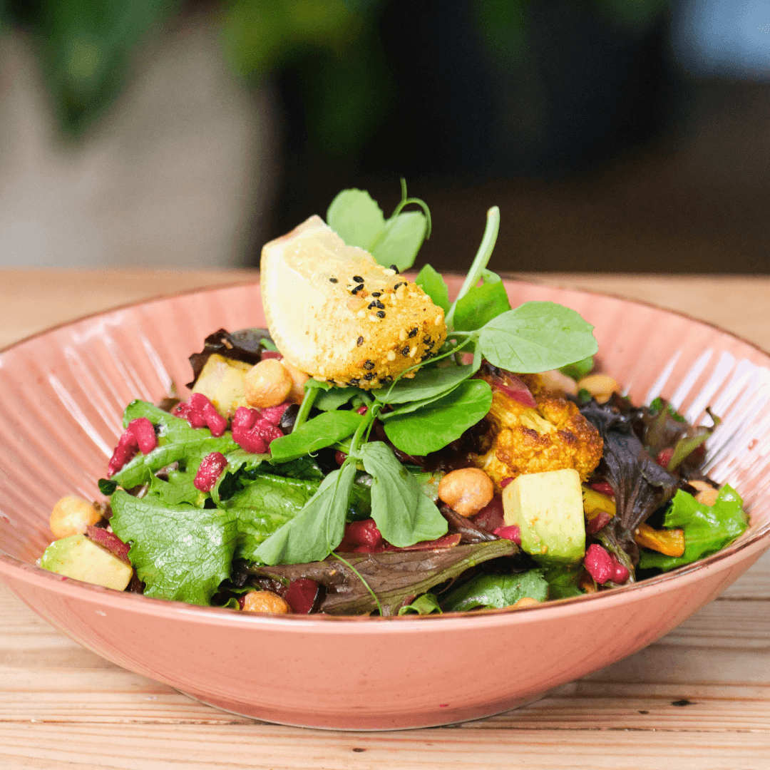 Roasted cauliflower, avo, pomegranate pearls, crispy chickpeas & green goddess dressing. Add chicken +$8 | salmon +$7 | tofu +$5 |